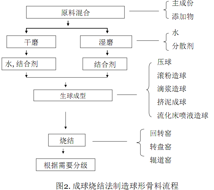 2.球形耐火骨料的優越性 球形物料良好的流動性為人們所共知,并為多個行業應用。如技術陶瓷行業把陶瓷粉體造成球形微粒以利成型,油田鉆井中使用玻璃微球潤滑鉆桿,涂料、塑料行業中使用球形填料,等等。球形骨料在耐火澆注料和噴射料中將大有用武之地,如有利于消除脹流,提高流動性,改善結構均勻性等,尤其是自流澆注料。自流澆注料適宜于形狀復雜而難以實施振動的部位,高的自流性是不言而喻的關鍵。在使用不規則骨料的配料方案中,為達到高流動性,人們不得不多用細骨料7和氧化鋁8、氧化硅9等超細粉。如此,不僅增加材料成本,還加大了襯體在高溫下的體積收縮。雖然可在配料中引入膨脹性礦物(如藍晶石族礦物等)可抵消一定的收縮,但可能對某些澆注料而言,會對高溫使用性能不利。超細粉難以均勻分散和造成濕混料的過早膠化也是傳統澆注料面臨的問題。為克服之,往往需引入各種價格相對貴的添加劑。它們也增加了材料成本,并可能對工作場所和環境造成一定污染。而采用球形骨料,則可在少用細粉和超細粉的情況下使澆注料達到良好的自流性,還可減少用水量,有利于獲得高致密度,提高襯體的強度。 球形骨料的粒度級配容易設計和控制,使用球形骨料有利于獲得高密實性耐火制品。若用球形骨料制造煉鐵高爐和有色金屬熔煉爐的炮泥,則可減少金屬熔體向炮泥中滲透,便于炮泥塞孔的打開,在炮泥塞孔的打開中減少熱噴槍的使用可延長塞孔的壽命10。炮泥密度的提高還可使它堆筑于塞孔的背后,從而保護塞孔和孔壁耐火材料。采用球形骨料制作炮泥也可能將其用于擴大到傳統炮泥不適用的地方,如冰銅被過度加熱或粘土熟料效果不佳之處。球形骨料的易滑動性可增加炮泥的塑性,使之易擠入,從而減少傳統炮泥中為滿足塑性而需的樹脂結合劑和增塑劑。 采用合適粒度級配的中空或微孔球形骨料可制成既輕質隔熱又不甚透氣的耐火襯體。氣密性良好的輕質隔熱襯體具有比非氣密性材料更好的隔熱效果,因為前者中的氣孔大多彼此孤立封閉,可減少高溫時的對流傳熱。氣密性隔熱襯體也有更強的抗腐蝕性,因腐蝕性介質向內部浸入的通道減少。以球形輕質骨料制成的隔熱襯體比傳統多孔輕質材料還具有更高的強度,這是因為(1)骨料內部的氣孔為封閉狀,不會造成應力集中,使得球形骨料自身的強度比傳統輕質骨料的高;(2)球形骨料表面沒有尖銳棱角,不會在骨料-基質界面出現應力集中而破壞骨料與基質的結合;(3)在由球形骨料制成的隔熱襯體中,骨料之間緊密結合而使強度提高。這種氣密性良好的襯體尤其適用于高溫、有一定的壓力且爐氣有腐蝕性、蒸汽介質的設備11。使用傳統襯體,通常需將設備的金屬外殼保持在較高溫度,以防止蒸汽結露而造成設備腐蝕。若使用氣密性隔熱襯體,設備外殼的溫度可降低,有利于實現節能、安全和方便操作。 球形骨料的優越性不僅適用于澆注料,也適用于定形制品。球形骨料可首先用于對流動性、輸送性、氣密性、隔熱性等要求高的場合。而后隨著骨料工程、特別是對骨料內部和表面的設計、定制技術的進展,新型骨料將給耐火材料帶來更多元、更優越特性,如高溫強度、抗熱震性、柔韌性、抗侵蝕性等。不難預料,球形骨料將成為新一代耐火骨料而取代傳統骨料,其潛在市場巨大,在包括定形的和不定形的大多數耐火材料中,骨料所占的比例達60%以上,而近十年全球耐火材料的平均年用量約在3800萬噸以上12。 3.可用于生產球形骨料的技術和設備 球形耐火骨料的生產可采用熔融法或燒結法。熔融法過程相對簡單,工藝成熟,早被用于制造各種各樣的高級耐火制品和原料,如AZS熔鑄磚、電熔鎂砂、電熔剛玉、氧化鋁和氧化鋯空心球等。與燒結法不同,熔融法須消耗高電能。其能否成為生產球形骨料的主流方法,我們將另文探討。本文著重討論燒結法制造球形骨料的可行性和經濟性。 燒結法生產球形耐火骨料可包括三個主要步驟,即粉體制備、生坯造球和燒成, 如圖2所示。